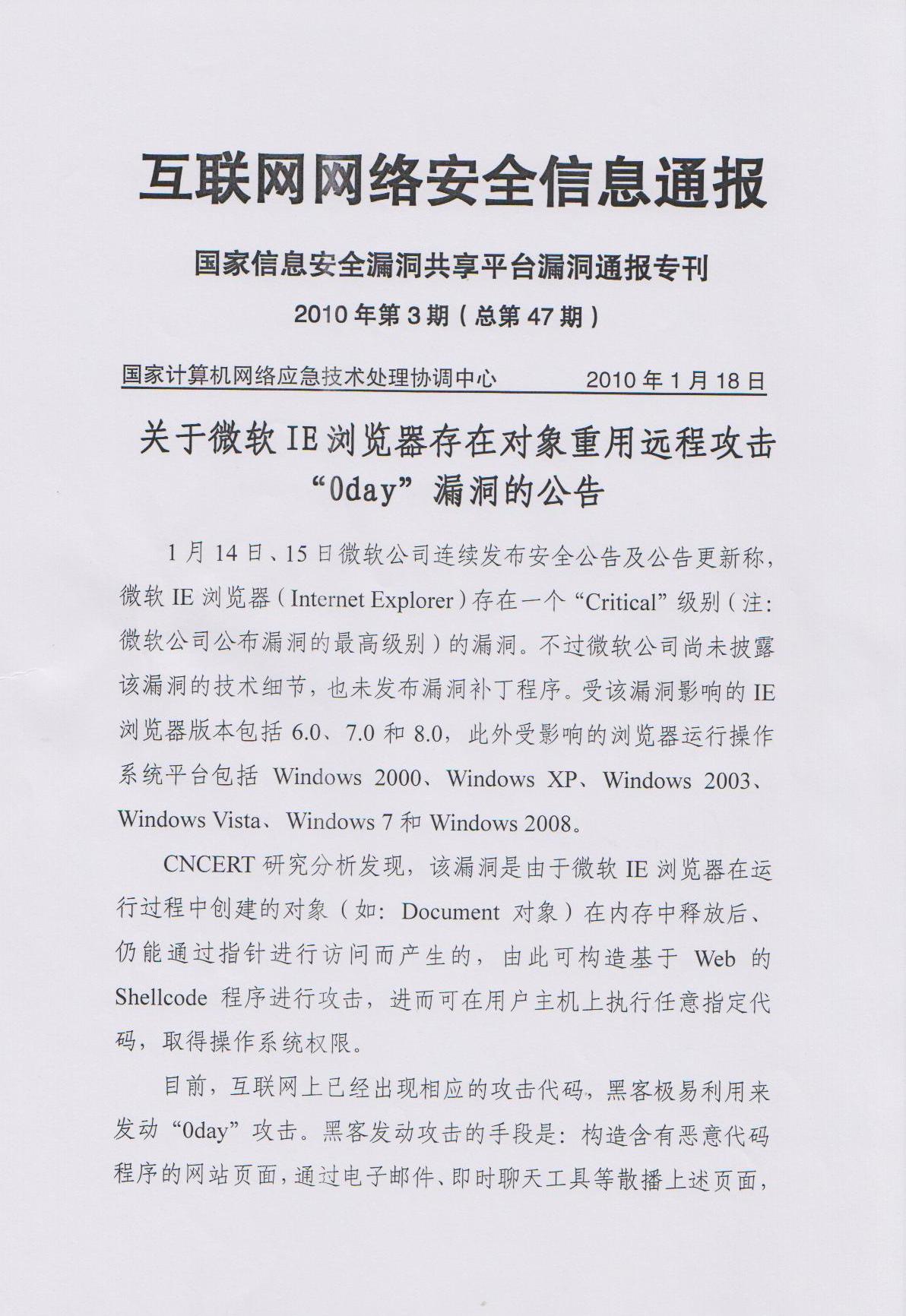 转发CNCERT关于微软IE浏览器存在对象重用远程攻击0day漏洞的公告