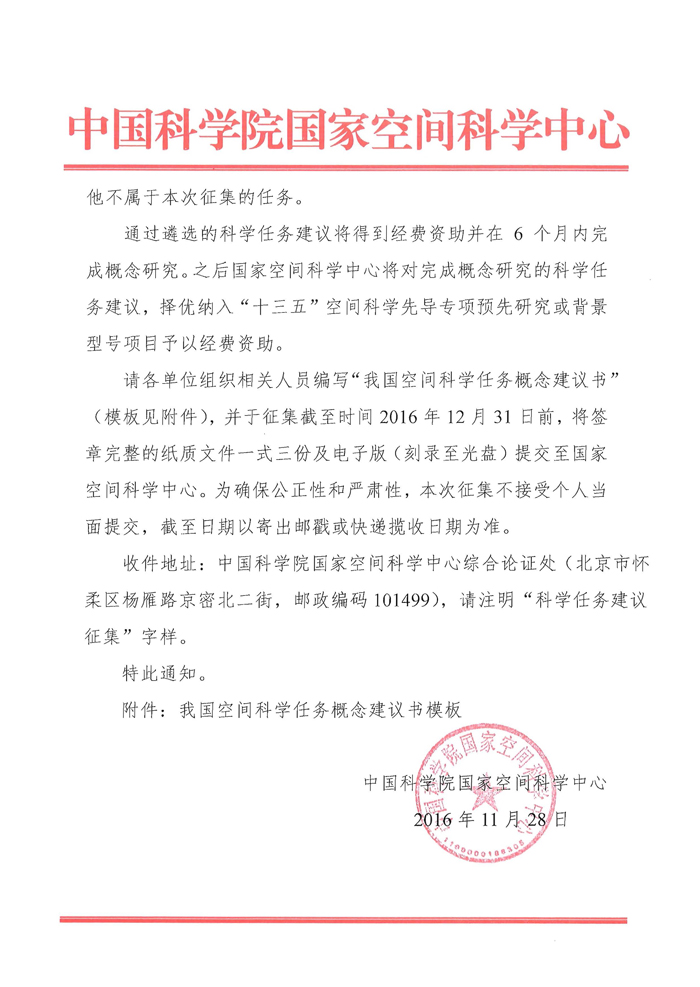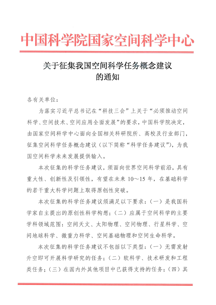 关于征集我国空间科学任务概念建议的通知