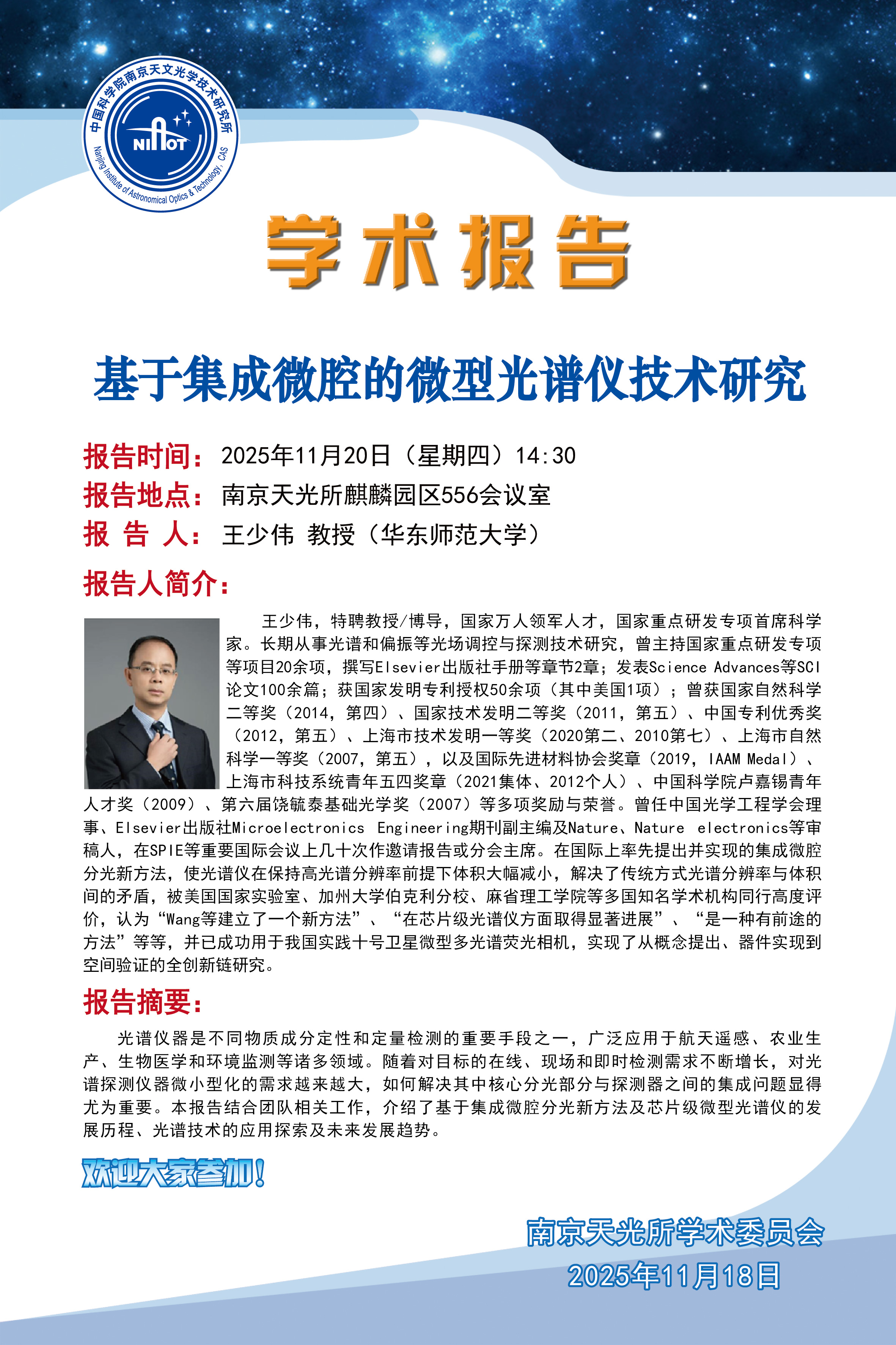 【11月20日】基于集成微腔的微型光谱仪技术研究