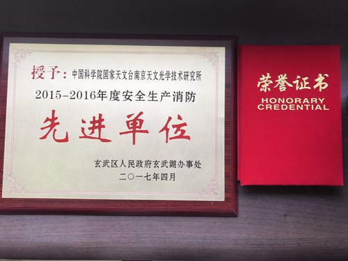 近日,中国科学院国家天文台南京天文光学技术研究所被南京市玄武区人民政府玄武湖办事处评为2015-2016年度安全生产消防先进单位,综合办苏利和郑健获安全生产消防工作先进个人荣誉。