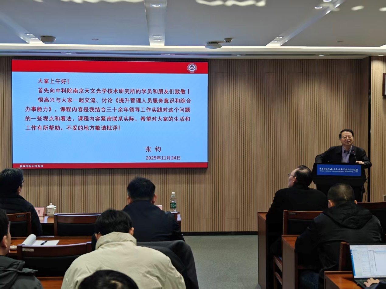 为强化管理支撑、服务科研攻关,中国科学院南京天文光学技术研究所于2025年11月24日举办了“提升管理人员服务意识和综合办事能力”专题培训班。来自管理部门和各科研部门的30余名人员参加了此次培训。会议由纪委书记任树林主持。